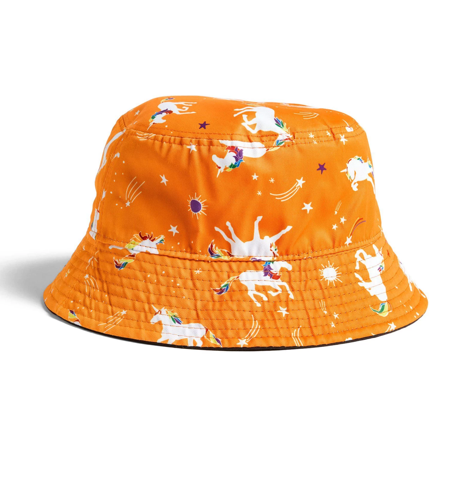 - Fully reversible: black with stitched X= patch at the front on one side; tangerine orange with galloping rainbow unicorns on the other side