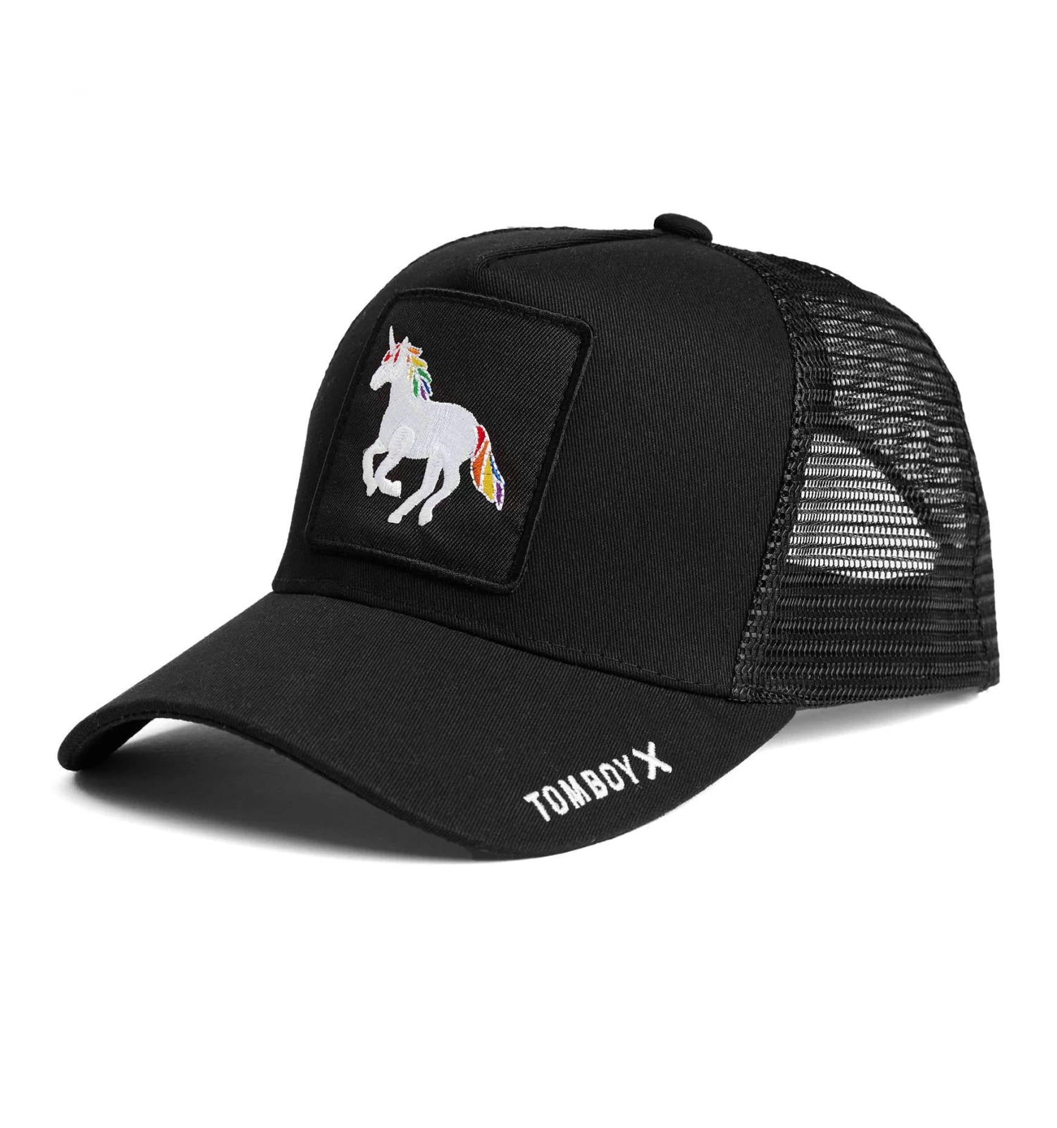 A magical rainbow-maned steed gallops across this black cap’s classic combo of sun-blocking bill and ventilating mesh.